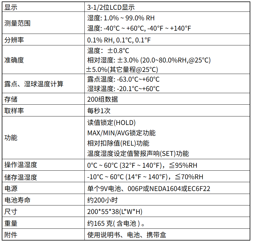 °C 或° F 单位切换。温度及湿度高低值警报设定 , 当超过或低于设定值时 , 蜂鸣器会发出声响。可记忆 200 笔量测记录。自动关机。最大值及最小值及平均值 (MAX/MIN) 锁定功能 , 及经过时间记录。资料锁定功能 (HOLD) 。相对值功能 (REL) 。露点温度测量。湿球温度测量。